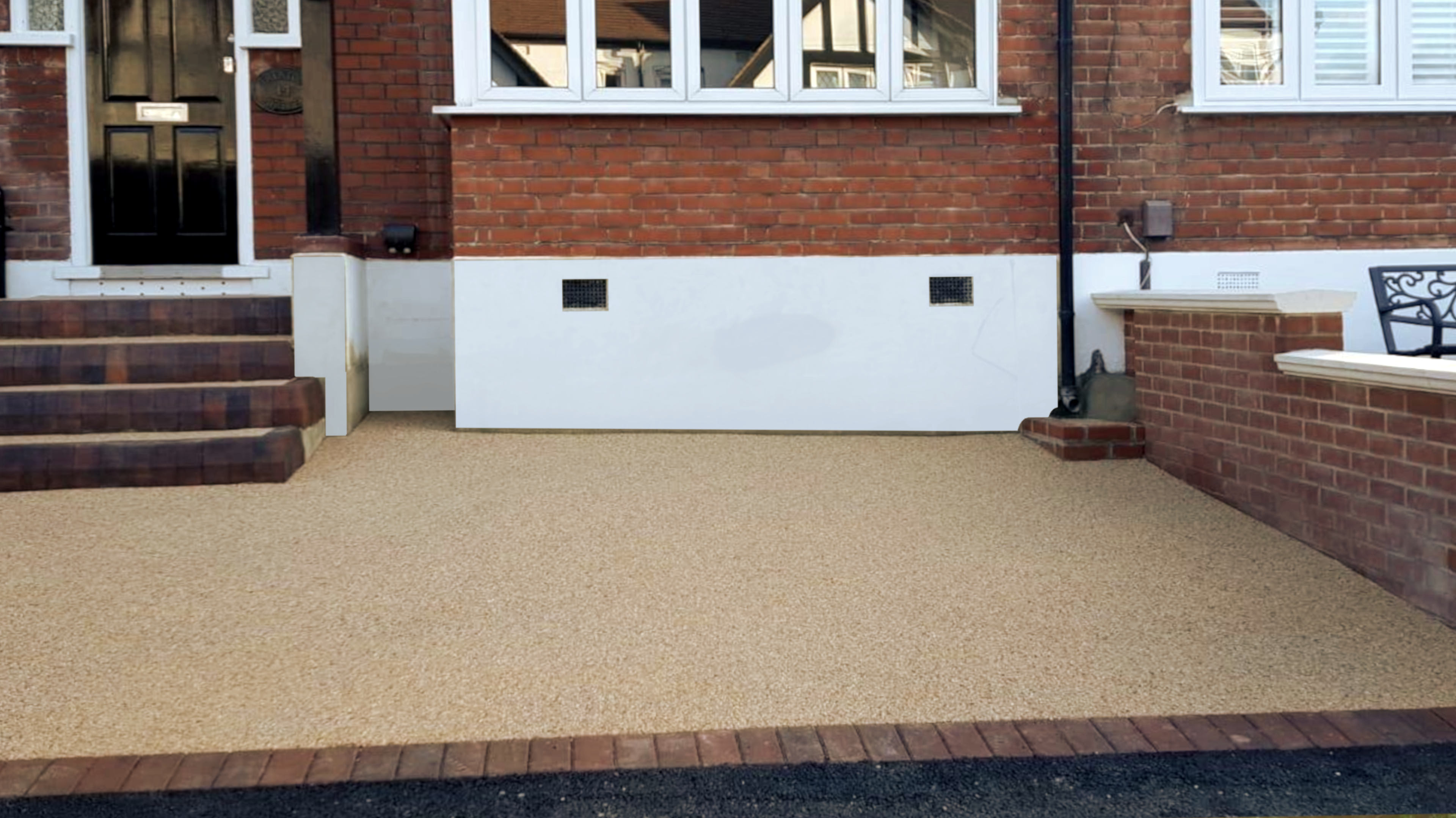 A North London driveway that had previously been paved was extended and excavated to create a spacious and more accessible area. The resin bound stone in ‘Natural Tan’ with the brindle block edging showcases the property perfectly